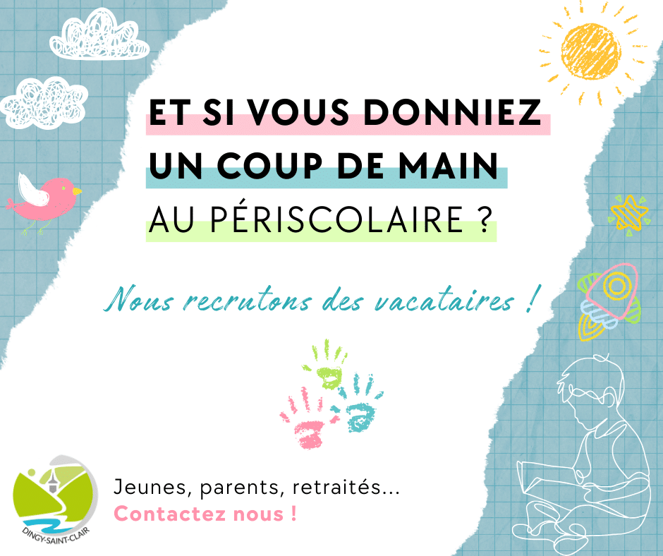 Envie de vous engager près de chez vous, la commune de Dingy-Saint-Clair recherche des vacataires pour assurer le remplacement ponctuel des agents du service périscolaire.